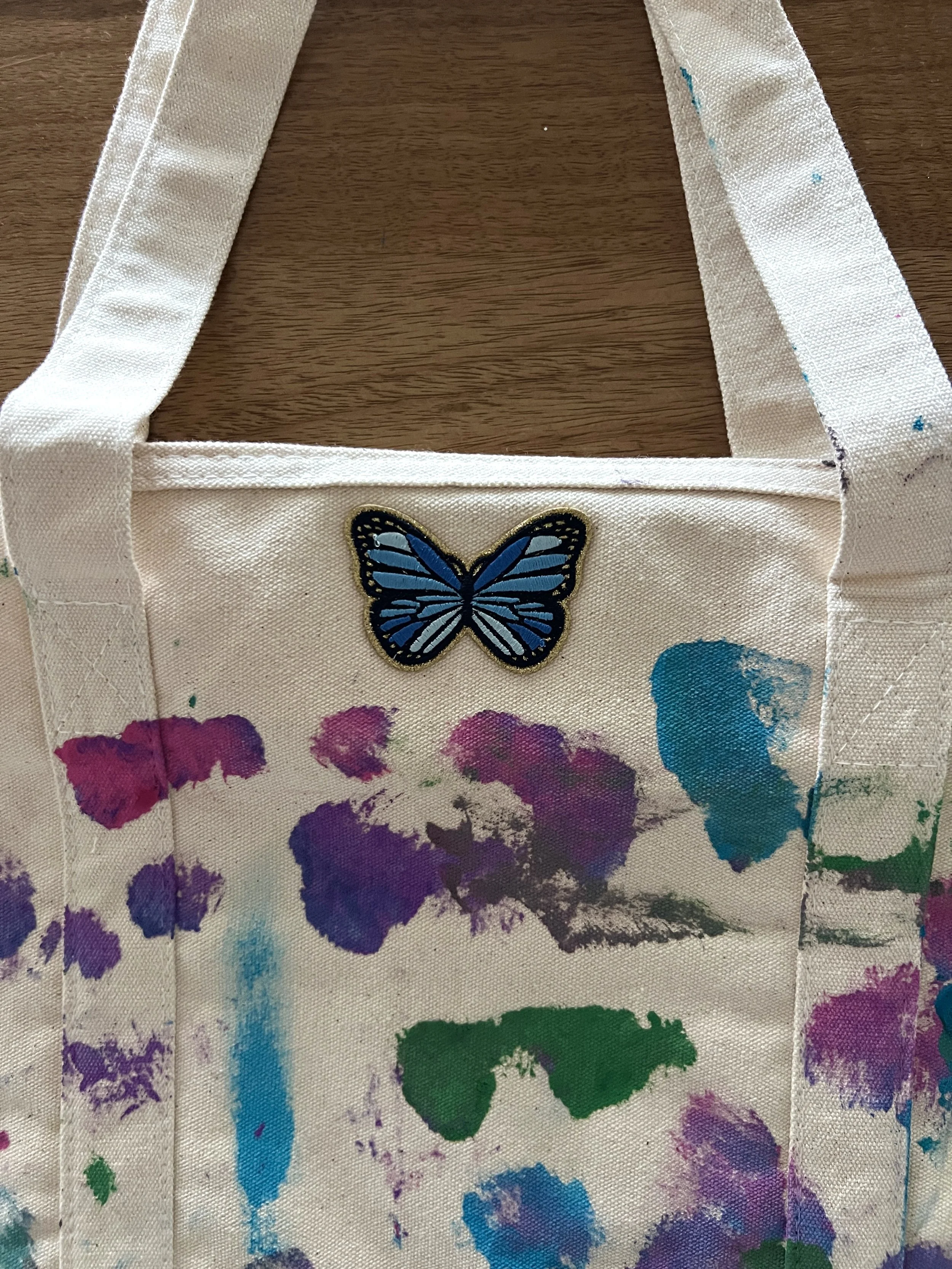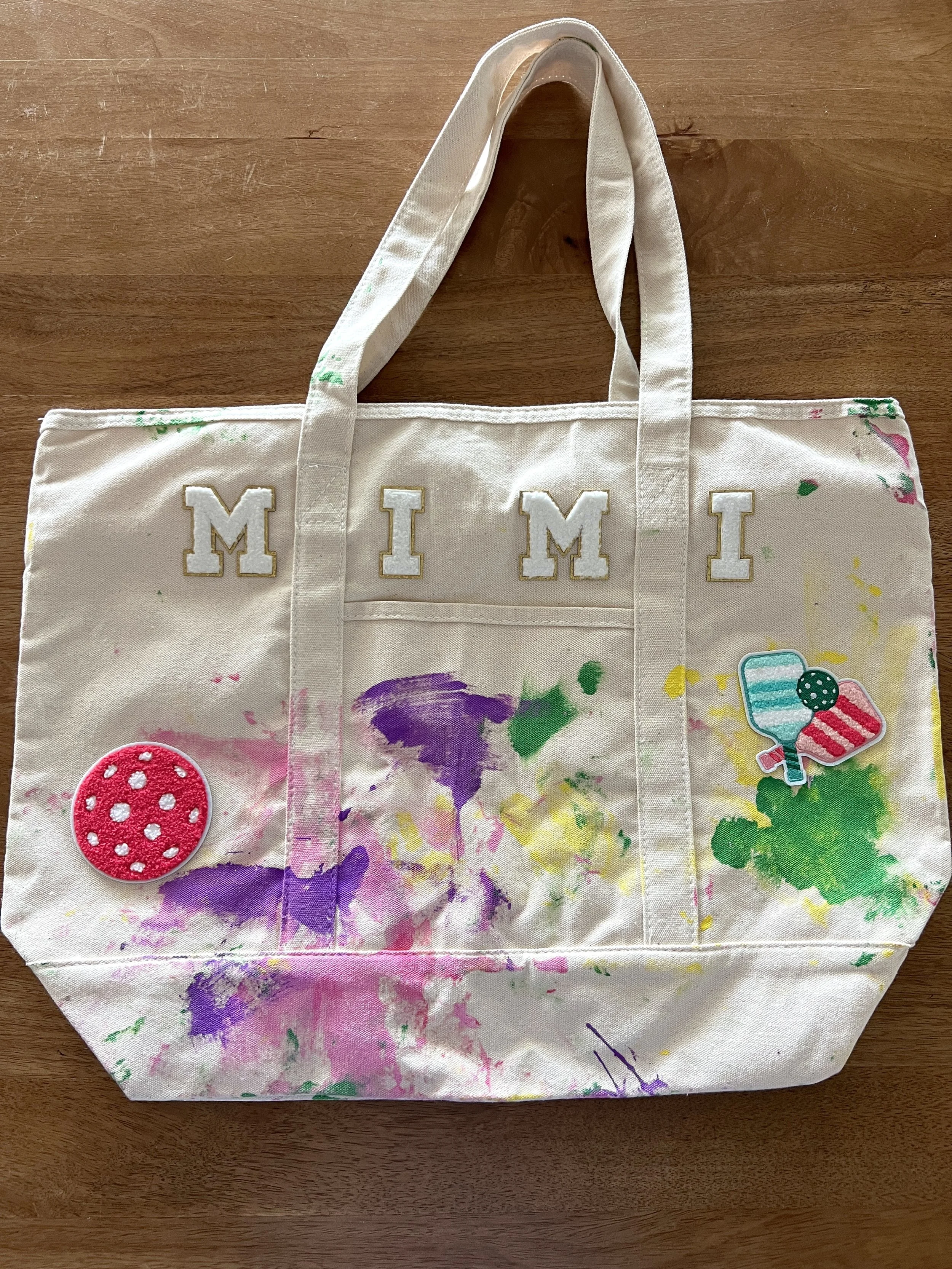 After the paint dried completely, we ironed on the name patches. “Mimi” went on one, “Gigi” on the other. We also added a few decorative patches that felt personal to each of them.