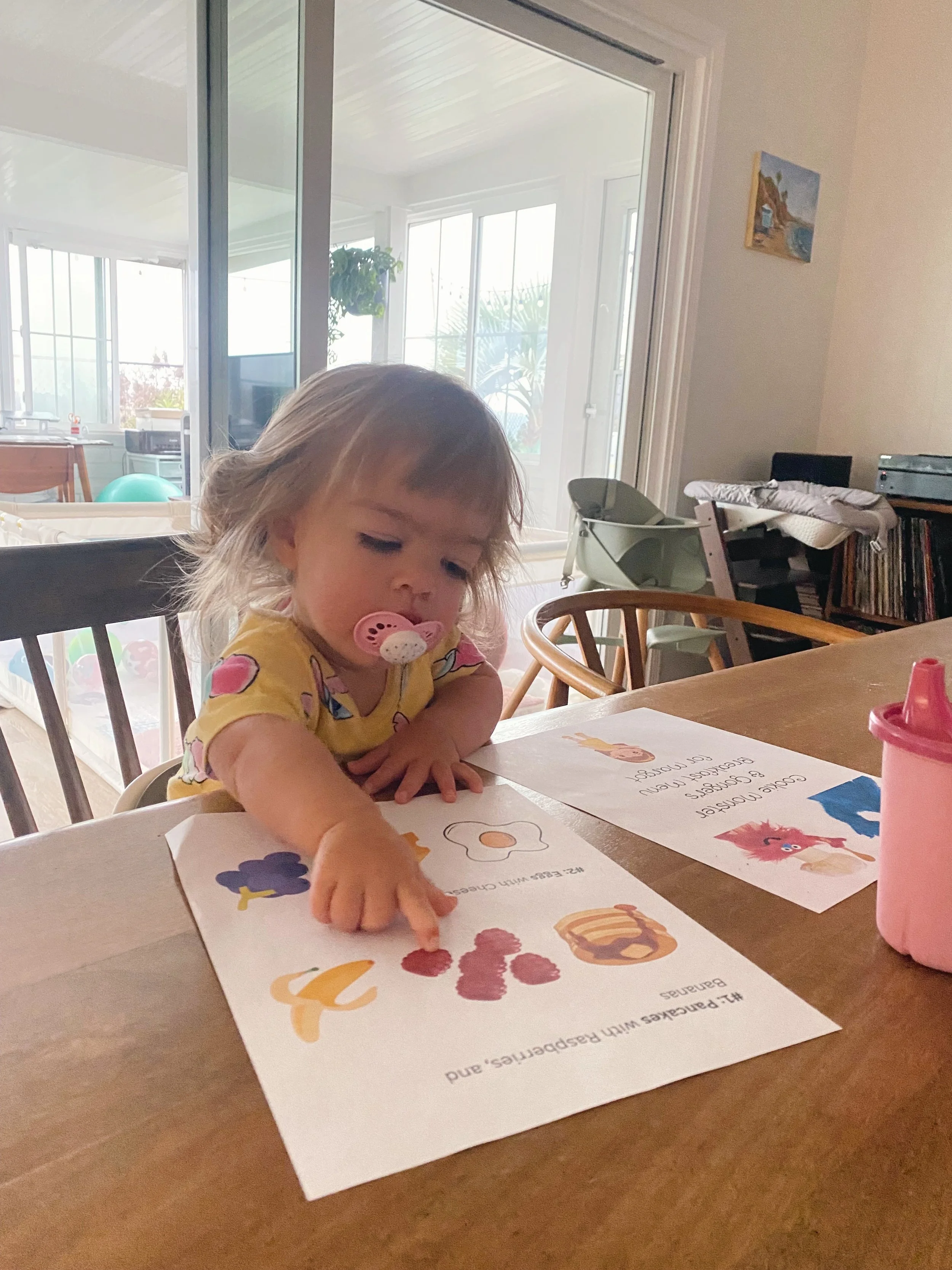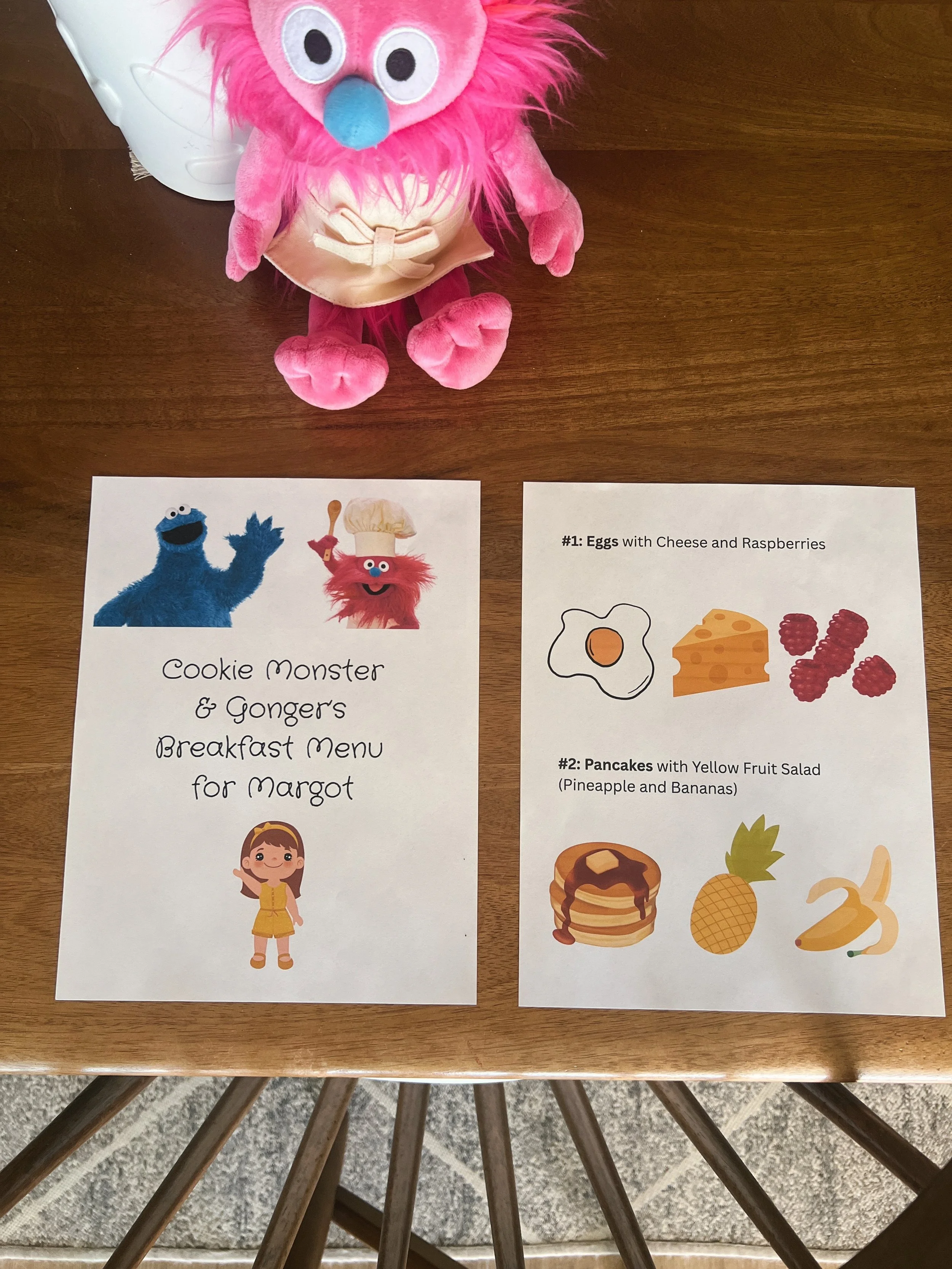 To make things easier for Kevin in the early hours, and more exciting for Margot, I decided to make a breakfast menu with 2 options every day. Cooked up by Monster Foodies, Chef Cookie and Chef Gonger (if you watch Sesame Street, you know), this has been wildly successful. She looks forward to it every morning to the point where we’re going on week 2 of breakfast menus. Made on Canva using free graphics, one of her favorite parts is the cartoon girl I chose to represent her. Below you’ll find some of her sample menus—the main dish is usually eggs, Veggies Made Great muffins, or mini pancakes with some sort of fruit side.